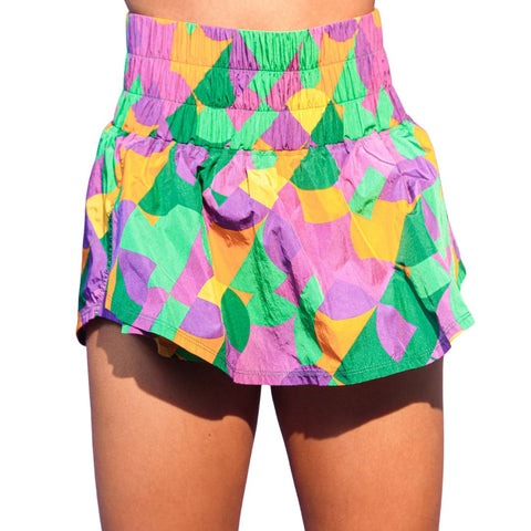 Purple, Green and Gold Patterned High Waisted Athletic Shorts (Each)