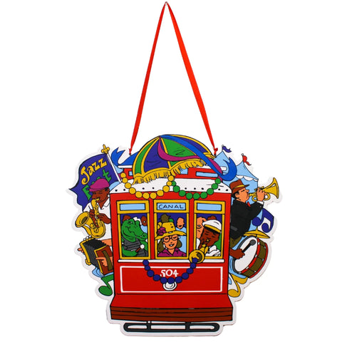 Iconic Canal Streetcar Design: This door hanger features a charming depiction of a Canal Streetcar, adding a touch of vintage New Orleans charm to your home decor or party venue.