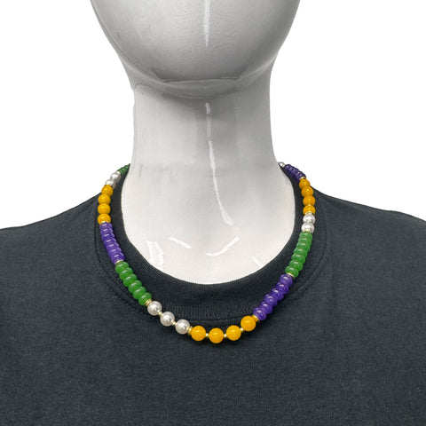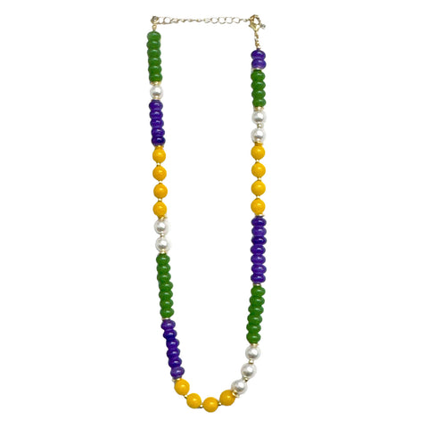 Festive Design: This necklace features a captivating color block design inspired by the vibrant spirit of Mardi Gras. The combination of Mardi Gras hues with clear glass beads creates a striking and eye-catching accessory that perfectly embodies the festive atmosphere.
