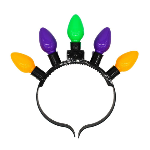 Vibrant LED Lights: This headband features colorful LED bulbs in purple, green, and yellow, adding a festive touch to any Mardi Gras celebration or themed event. The lights create a dynamic and eye-catching display that enhances your party outfit.