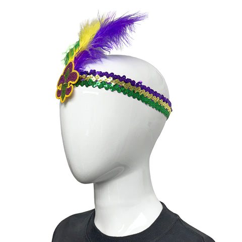Purple, Green and Gold Sequin Headband with Fleur de Lis and Feathers (Each)