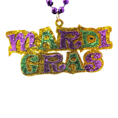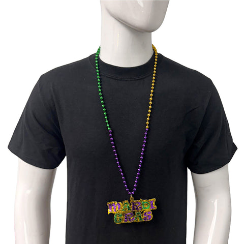 33" 7mm Purple, Green and Gold Bead with Glittered Mardi Gras Medallion