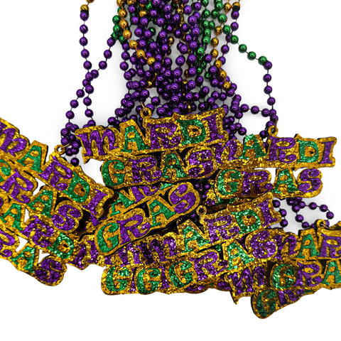 33" 7mm Purple, Green and Gold Bead with Glittered Mardi Gras Medallion (Dozen)