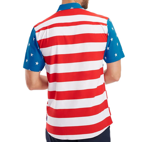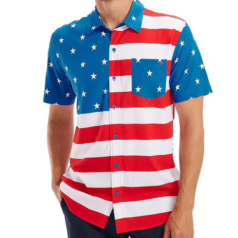 Patriotic Aesthetic This button-down shirt features a vibrant stars and stripes design that showcases a bold American theme for any social event. The classic pattern ensures you stand out in the crowd while participating in national celebrations or themed gatherings.