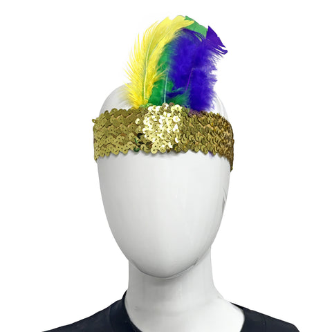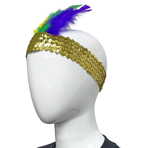 Gold Sequin Headband with Purple, Green and Gold Feathers (Each)